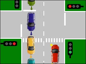 ![]() | LET OP: alhoewel het licht groen is, mag de bestuurder van de rode auto het kruispunt nog niet oprijden. Hij moet wachten tot het vrij is. Maar hij mag, terwijl hij wacht, NIET op een oversteekplaats blijven staan. |