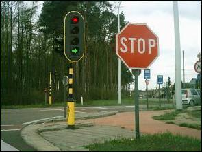![]() | Een rond verkeerslicht moet rechts van jou staan. Het mag boven de de rijbaan en ook links van de rijbaan herhaald worden. |