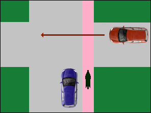 ![]() | Een tweede uitzondering is wanneer er een doorlopend trottoir of een oversteekplaats voor voetgangers is. Ook in dat geval moet de bestuurder die van rechts komt, de voetgangers voor laten gaan, voor hijzelf en de bestuurder die voorrang heeft gegeven, het kruispunt mogen oprijden. |