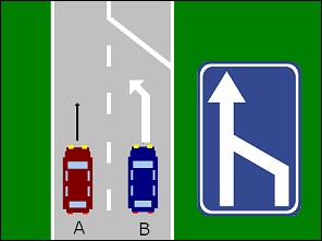 ![]() | Bij een vermindering van de rijstroken langs links moet de bestuurder die op de linkse rijstrook rijdt (de blauwe auto) voorrang verlenen aan het rechtdoorgaand verkeer (bruine auto), omdat het veranderen van rijstrook een manoeuvre is waarbij je voorrang moet verlenen. Dit is niet volgens de wegcode, maar er zijn verschillende rechtspraken waarin dit beslist werd. |