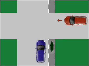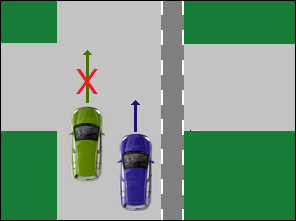 ![]() | Gestopt en geblokkeerdAls de bestuurder die van rechts komt vertraagt, of volledig stopt, behoudt die dus zijn voorrang. Maar als de bestuurder die van rechts komt de voorrang niet kan nemen, omdat een reeks auto's de rijbaan dwarsen, dan moet de bestuurder die voorrang moet geven niet nutteloos blijven wachten, maar mag hij het kruispunt oprijden. |