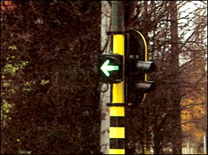 ![]() | Soms is bij de ronde verkeerslichten een groene pijl geplaatst. Brandt een groene pijl, terwijl ook het ronde rode licht brandt, dan wil dit zeggen dat voertuigen in de richting van de pijl mogen afslaan. Maar wil een bestuurder het kruispunt oprijden, moet hij wel heel voorzichtig zijn en voorrang verlenen aan alle weggebruikers die uit de andere richtingen komen. |