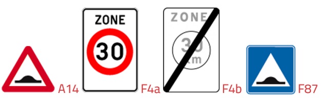 ![]() | De maximumsnelheid op verhoogde inrichtingen bedraagt 30 km/u in 3 gevallen. Op de openbare wegen met verhoogde inrichtingen: